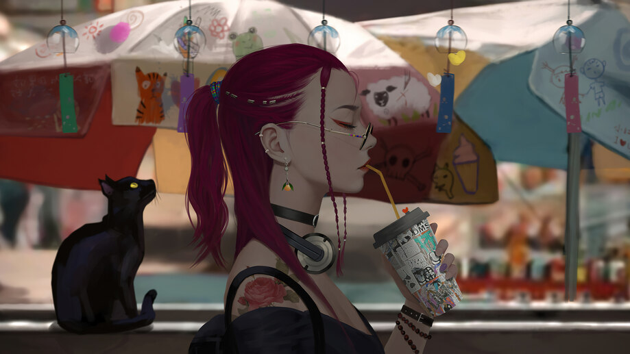 Anime Girl Drinking with Cat 4K #9270f Wallpapers