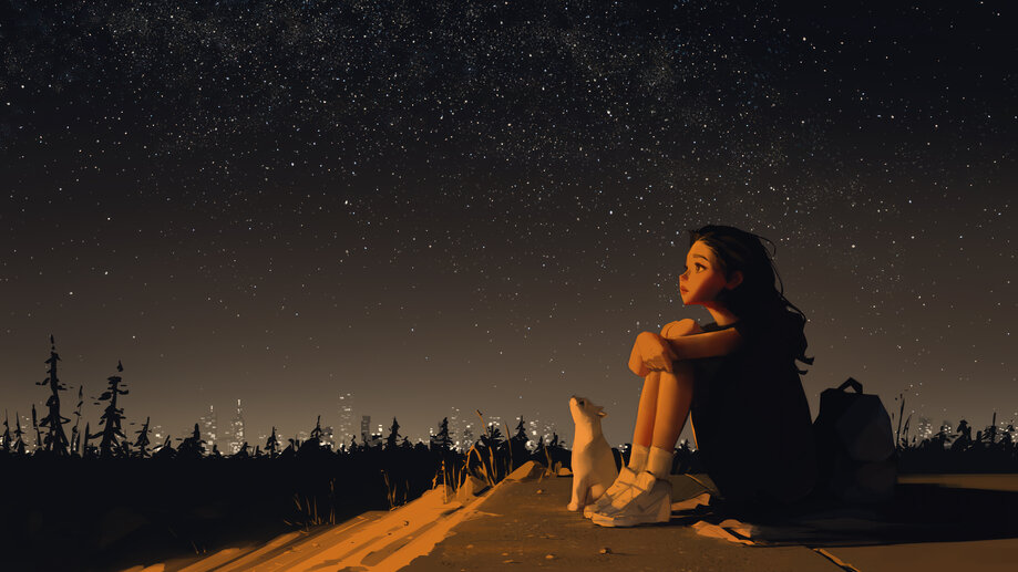 Stargazing Anime Girl Cat Night 4K #1741n Wallpapers