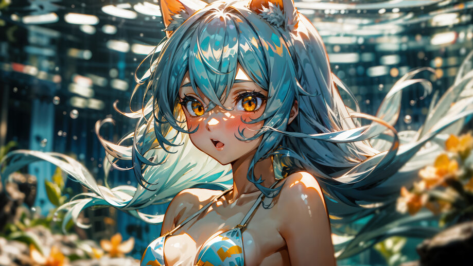 4K PC Desktop HD Wallpaper 1675b | Anime, Cat, Girl, Underwater, Blue Hair, Yellow Eyes, 4K and 4K Phone iPhone wallpaper HD background with search keywords . Awesome Ultra HD 4K wallpaper for PC, Laptop, Desktop Computer, (Razer, Apple MacBook, MSi, Alienware, Asus, Gigabyte Aorus, HP, Lenovo, Dell, Samsung Galaxy Book), Smart TV Screen, Video Game Console Monitors (Sony PlayStation, Microsoft Xbox).