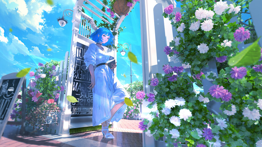 4K PC Desktop HD Wallpaper 1785b | Anime, Girl, Flower, Garden, Short, Blue Hair, 4K and 4K Phone iPhone wallpaper HD background with search keywords . Awesome Ultra HD 4K wallpaper for PC, Laptop, Desktop Computer, (Razer, Apple MacBook, MSi, Alienware, Asus, Gigabyte Aorus, HP, Lenovo, Dell, Samsung Galaxy Book), Smart TV Screen, Video Game Console Monitors (Sony PlayStation, Microsoft Xbox).