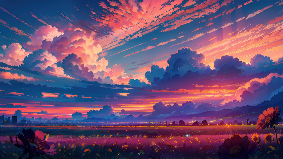 3495c | Sunset, Sky, Clouds, Grassland, Scenery, 4K Wallpaper