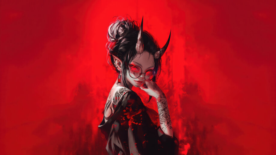 4K PC Desktop HD Wallpaper 1295h | Anime Girl, Tattoo, Demon, Horn, Red Eyes, Glasses, 4K and 4K Phone iPhone wallpaper HD background with search keywords . Awesome Ultra HD 4K wallpaper for PC, Laptop, Desktop Computer, (Razer, Apple MacBook, MSi, Alienware, Asus, Gigabyte Aorus, HP, Lenovo, Dell, Samsung Galaxy Book), Smart TV Screen, Video Game Console Monitors (Sony PlayStation, Microsoft Xbox).